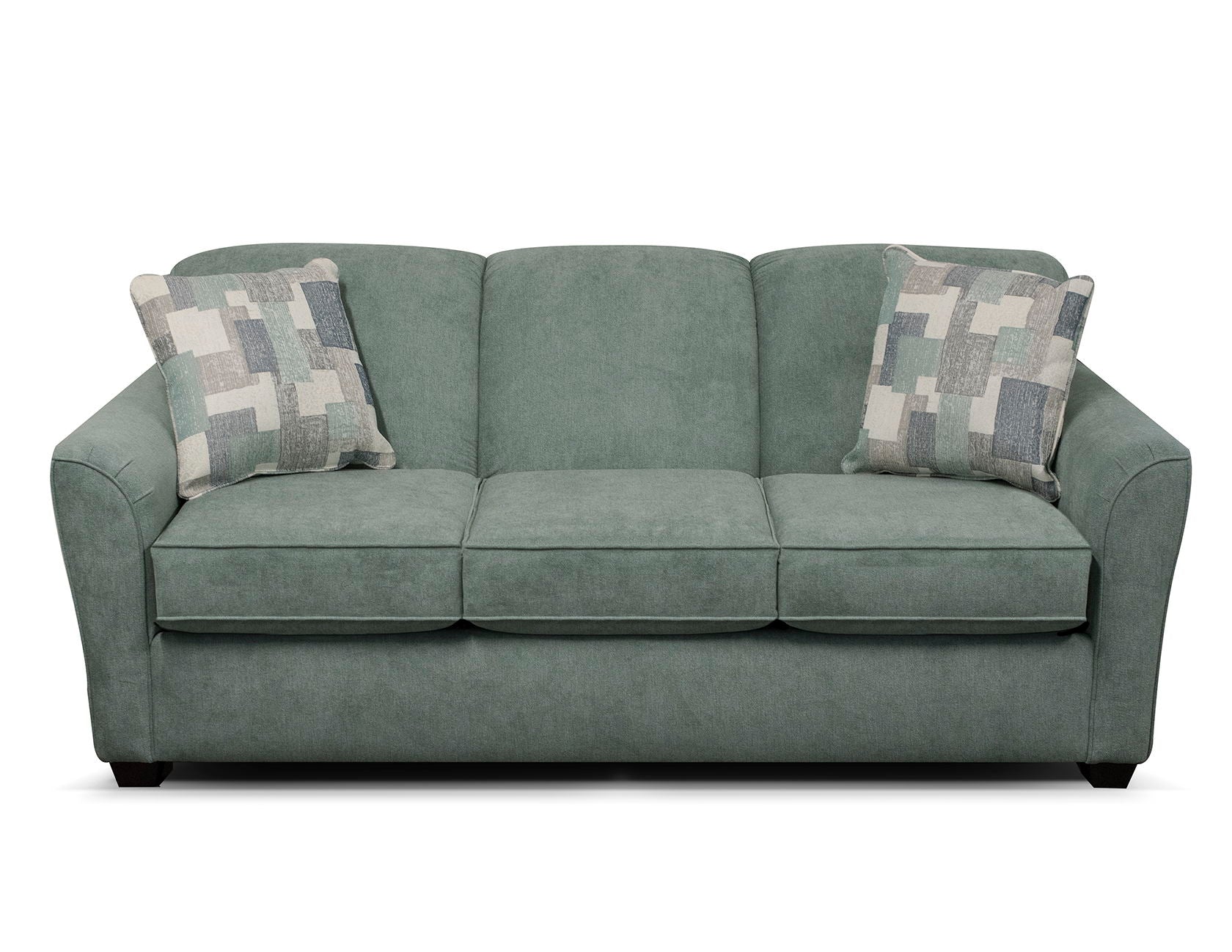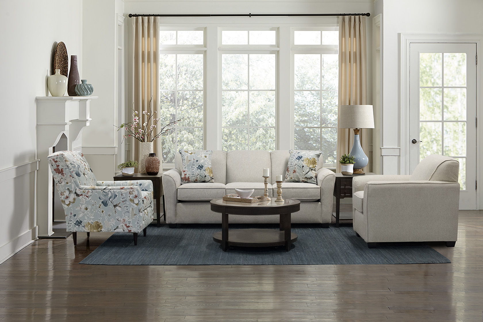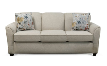 Our Smyrna collection features a contemporary sofa, loveseat, chair, and ottoman, as well as queen, full, and twin sleepers. The sofa boasts a three over three configuration with a channel stitched back over bordered seat cushions and a clean front rail. The modified half-moon arms are slightly flared. The sleeper is available with a standard, Visco, or air mattress.